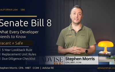 DESCRIPTION: California's Senate Bill 8 has a little-known provision that can turn a vacant property into a forced affordable housing obligation — and most developers don't find out until it's too late. In this video, Stephen Morris (CPA, MBT, CCIM) breaks down...